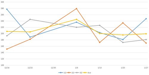 試合アベレージは175.84と昨年12月の189.75から大きく落ち込んでしまいました。年明け早々211.00と幸先良いスタートを切ることが出来たと喜んでおりましたところ、その後はボロボロになってしまいプラスになったのは13試合中2試合のみでした。 これはドット…