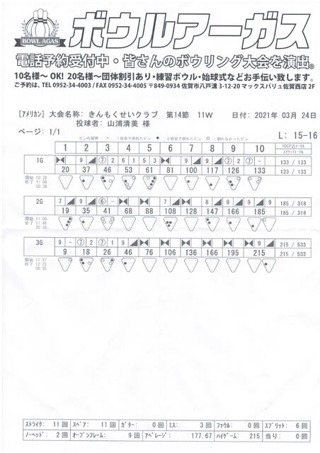 通算12,142ピン/69ゲームで、アベレージが175.97(-24.03)になりました。