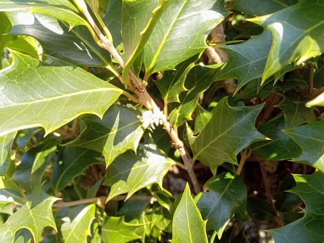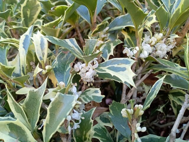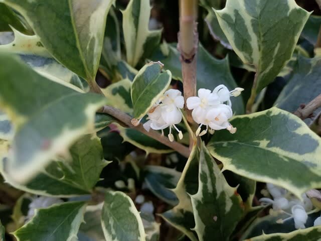 2021-12-24 ヒイラギの花 ブログ 正月を前に適期からずれていますが柊の剪定を行いました。剪定前には葉で覆われて気づきませんでしたが、可憐な花が咲いておりました。 我が家には斑入りの柊が裏の垣根に4本、表に斑が入いっていない柊が1本植わっております。そちらの柊も咲いておりました。 柊は葉が棘みたいに尖っておりますので痛い目に遭わされることが多いので近寄りがたいものがあります。それはこの小さくて可憐な花を守るためなのでしょうか!?