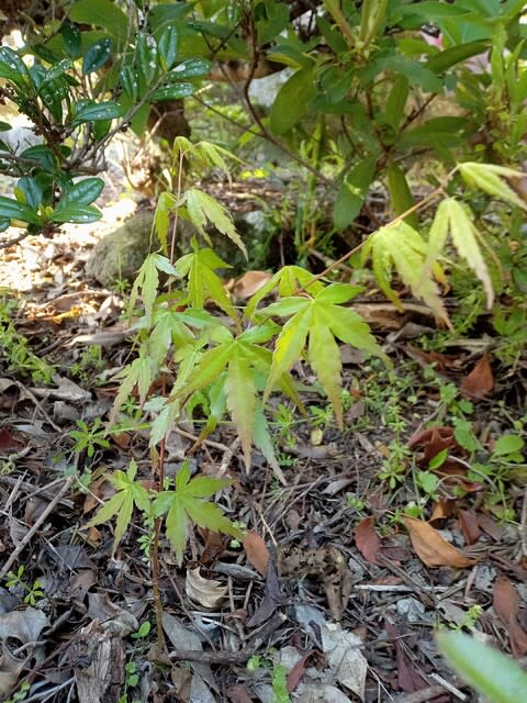 2022-04-16 実生のモミジ~2年目 ブログ 昨年、仕事先から実生のモミジ苗を2鉢いただきましたので庭に地植えしておりました。どうやら2本とも活着してくれたようです。 1本は半日蔭に、もう一本は日当たりの良い場所に植えております。もっとも半日蔭といってもツツジの陰ですので成長すれば日当たりが良くなりますが・・・。 これまでは庭木や果樹は2年目以降の苗を購入したものばかりでしたので、実生1年目の苗は初めての経験です。勝手が分からないままやっておりましたが、何とか無事に育ってくれたようです。 さて今年は小さいながらも紅葉を見ることが出来るでしょうか!!!