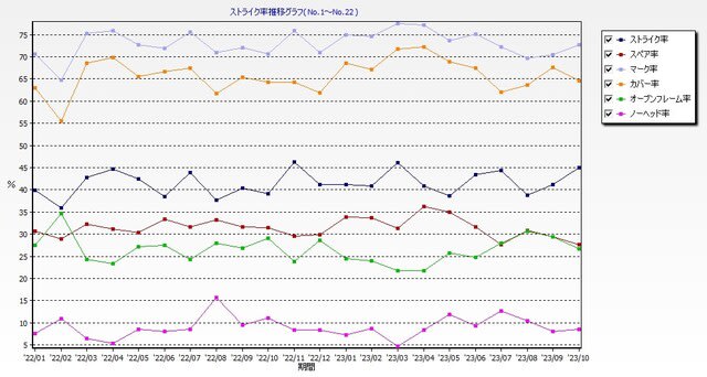 58.88⇒60.93⇒69.86⇒76.47⇒70.00⇒65.51⇒67.74⇒57.14⇒62.50とやや改善したものの低調なままです。藤川プロからの指摘では、1投目は肩が廻る現象を相当に抑え込むことが出来ているが、2投目に当該現象が発現してしまうことが多いとのことです。何とか対策を講じなければなりません。